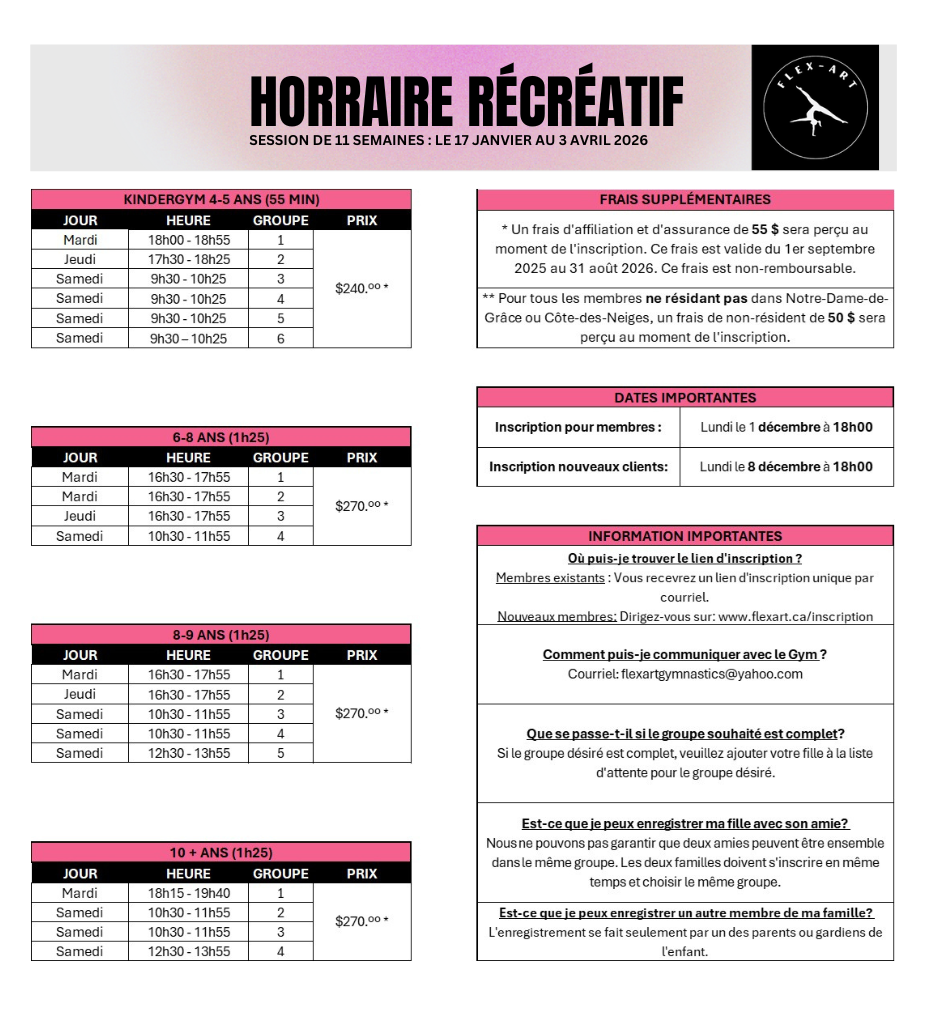 Our general recreational gymnastics classes for girls aged 6 to 15 offer an exciting and supportive environment for developing gymnastics skills. These 90-minute classes are designed to accommodate different skill levels and help each participant progress at her own pace. Here, we will master the basics of the four apparatuses of gymnastics: Floor, Beam, Bars, and Vault. Join us for a fun-filled and rewarding experience where your child can explore the joy of gymnastics, improve her skills, and make new friends. Our general recreational classes are the perfect way to nurture a love for the sport while building confidence and having a great time! We offer courses on Tuesdays Thursdays, and Saturdays. The groups are separated by age.